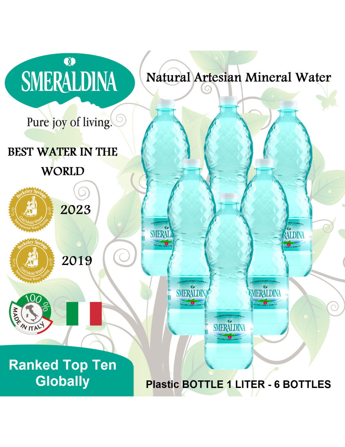 Smeraldina Natural Mineral Water from Italy PET 1000 ml x 6 bottles Best worldwide bottled water 2019 - 2023